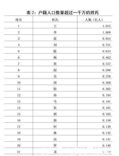 摘要:根据权威部门最新统计,得出了中华姓氏的最新排名,王姓打败李姓,占据第一宝座。但是两大姓氏之间的人口差距并不太大,将来王姓是否能继续独占鳌头还说不定。张姓稳坐第三,